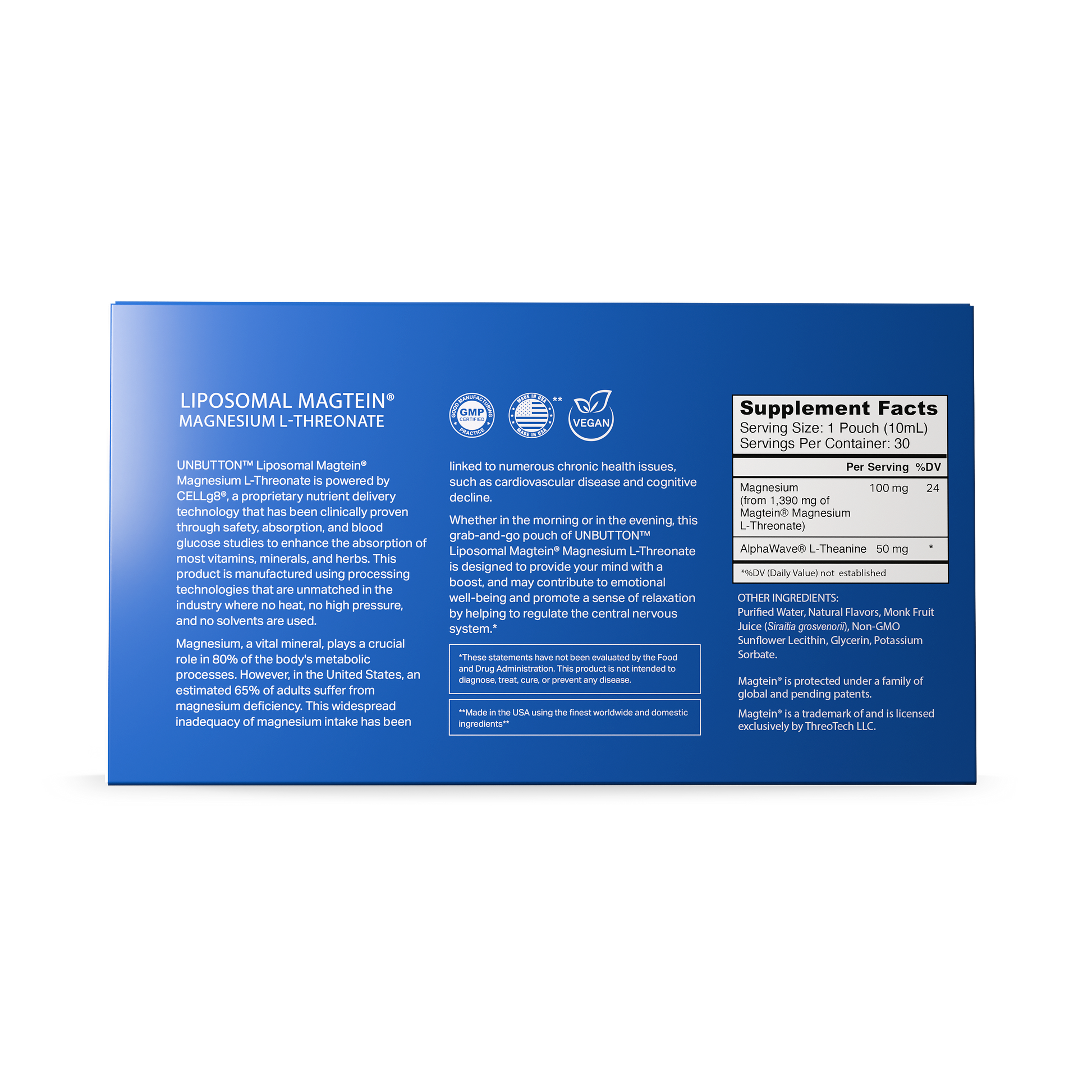 Each daily pouch of UNBUTTON contains 1,390mg of Liposomal Magnesium L-Threonate, optimized for absorption into the bloodstream.